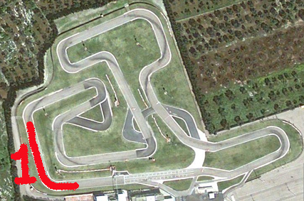 1. Curvone Ferrari Alla prima curva, di 18 metri di raggio, sono frequenti gli inserimenti appaiati, dopo la staccata in fondo al rettilineo di partenza. Lo spazio piuttosto ampio all'esterno della carreggiata rassicura nel tenere giù il piede, nell'imboccare il successivo rettilineo di 65 metri.